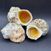 Appearance: They have a rough, exterior, inside colours can range from a pale yellow to a deep orange/gold, the outside of the shell is patterned with browns, beige, and white. Each shell is unique the varying colours.